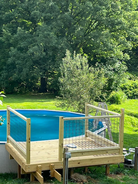 I took a photo of it this morning! Once the gate and stairs are done, the inspector will come, then Tim can add the ladder that attached to the deck and we'll be able to use the deck. The other ladder will be stored in the barn.Doesn't it look great? The gate will have the same panels. This will make it nice for being able to still see the swimmers. I'm going to put a chair up there and maybe an umbrella.